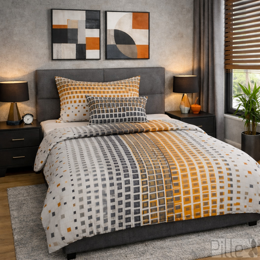 A szürke, fehér és narancssárga árnyalatok harmonikus átmenete elegáns, mégis karakteres megjelenést kölcsönöz az ágynak.
