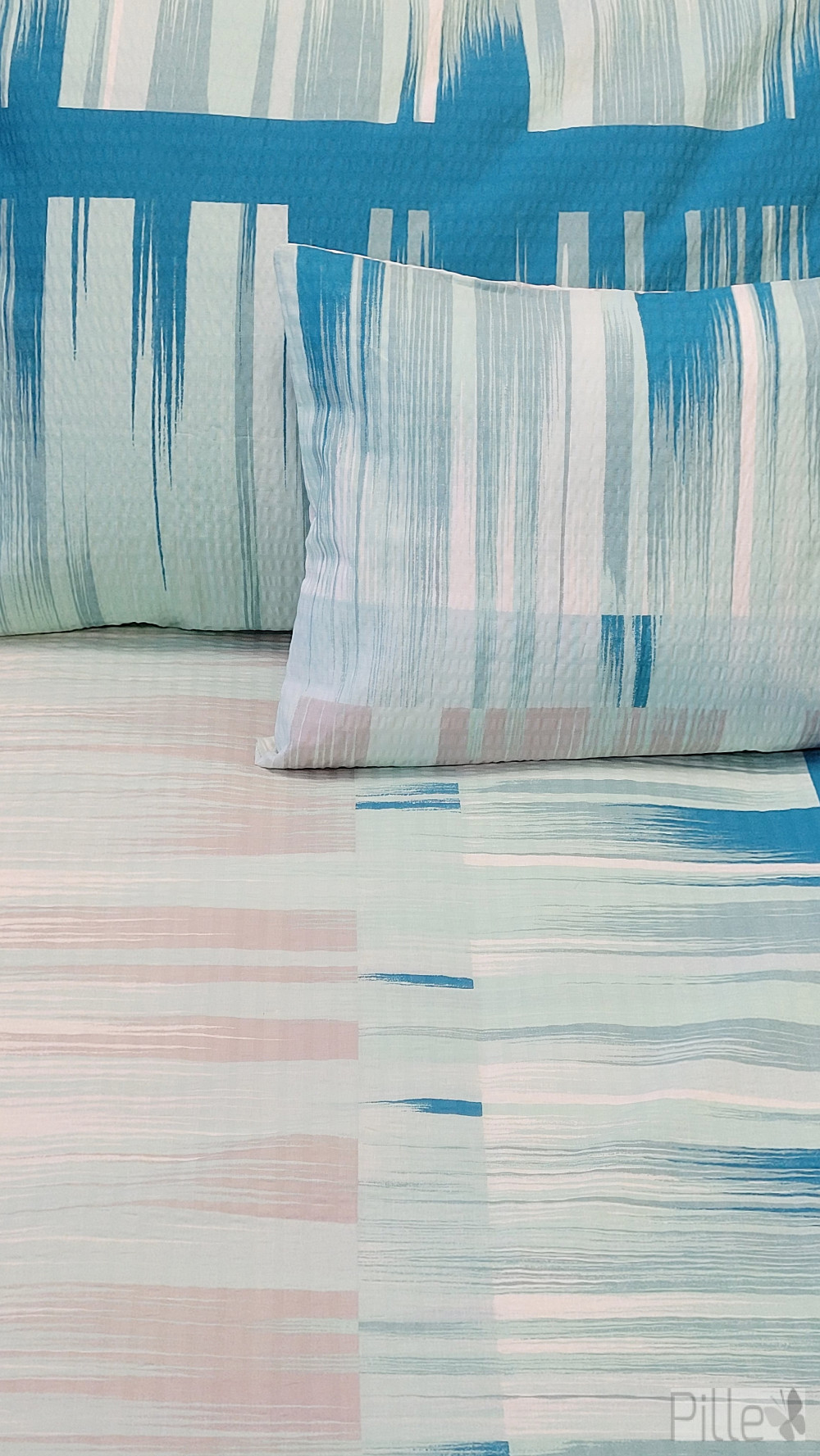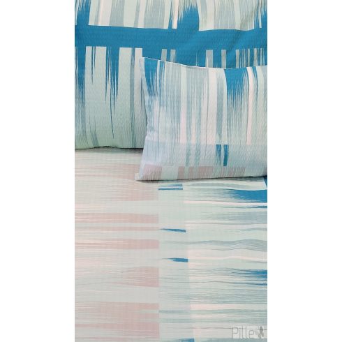 A türkiz, világoskék és finom pasztell árnyalatok ecsetszerű mintával kombinálva friss, nyugtató összhatást keltenek.
