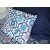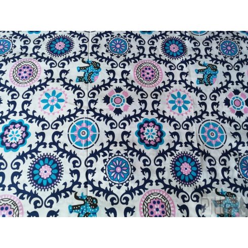 A részletgazdag kék, türkiz és púder árnyalatok harmonikus összhatást teremtenek, miközben a sötétkék párnahuzat elegáns kontrasztot biztosít.